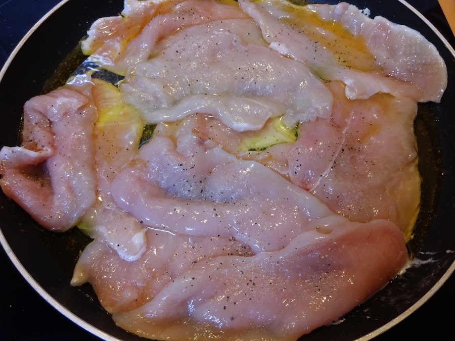 En la misma sartén vamos a echar un poco más de aceite y freímos los filetes de pollo salpimentados.