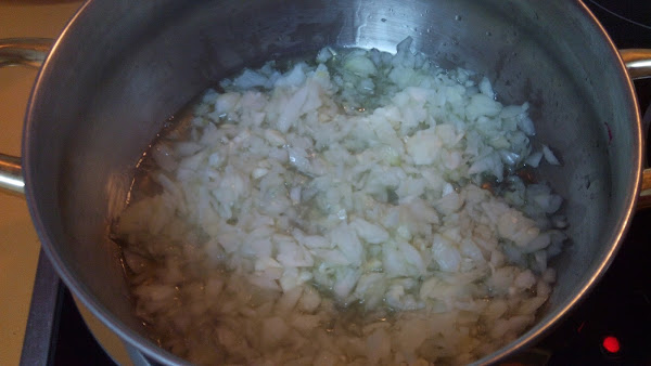 En una cacerola amplia echamos un chorreón de aceite y sofreímos los ajos y las cebollas bien picaditos.