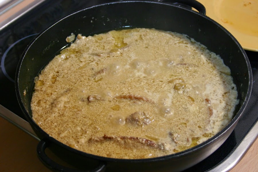 una vez la cebolla este bien pochada, añadimos los filetes que teniamos reservados