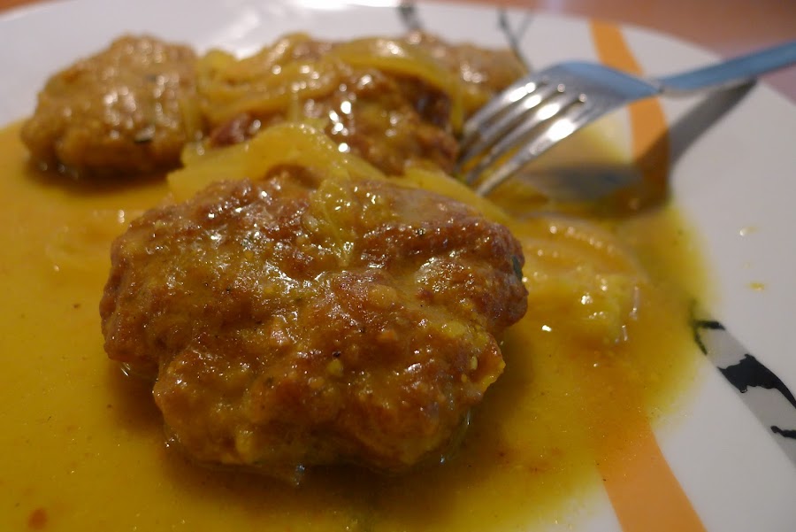 Pochamos la cebolla cortada en juliana,de forma que nos quede blandita,añadimos los filetitos,el vino blanco,el majado de almendras y un poco de agua hasta cubrir la carne y dejamos hacer unos 20 minutos.A mitad de coccion salaremos o añadiremos el avecrem y un poco del colorante o azafran.