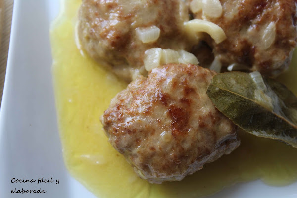 En el aceite que habíamos reservado, doramos el ajo y la cebolla hasta que esté transparente la cebolla, incorporamos la hoja de laurel y el vino, dejamos hervir 3-4 minutos. Incorporamos los filetes rusos y añadimos el agua,salpimentamos,. Llevamos a ebullición, bajamos a fuego medio-bajo y dejamos que se reduzca la salsa a la mitad, aproximadamente 8-10 minutos. Listo para comer, no olvidéis el pan para mojar en la salsa, yo he mojado tanto que he perdido el reloj en la salsa, jeje.