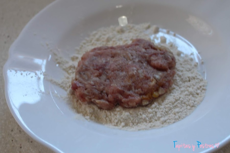 Hacemos bolas y aplastamos. Pasamos por harina.