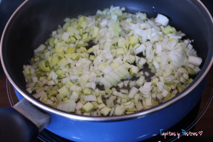 Vamos con la salsa. Pochamos la cebolla y el puerro.