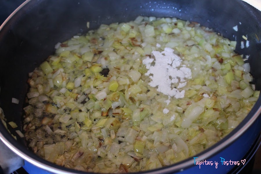 Cuando esté transparente agregamos el ajo picadito y damos unas vueltas. Añadimos la cucharada de harina, removemos para que la harina no se quede cruda y agregamos el vino y el agua. Dejamos que se evapore el vino unos minutos.