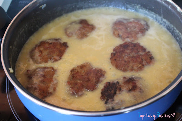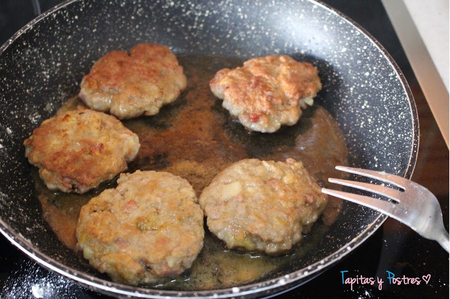 Cogemos porciones de carne y hacemos una bola. Sería conveniente hacerlo con las manos húmedas, asi no se pegará la carne a las manos. Aplastamos cada bola y las pasamos ligeramente por harina. Las freímos en aceite hasta que se doren y las reservamos aparte.