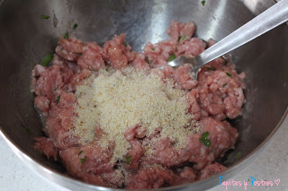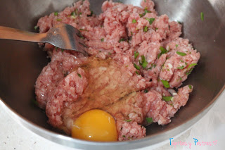 Machacamos la carne, la sazonamos y añadimos todos los ingredientes menos el pan rallado. Mezclamos bien.