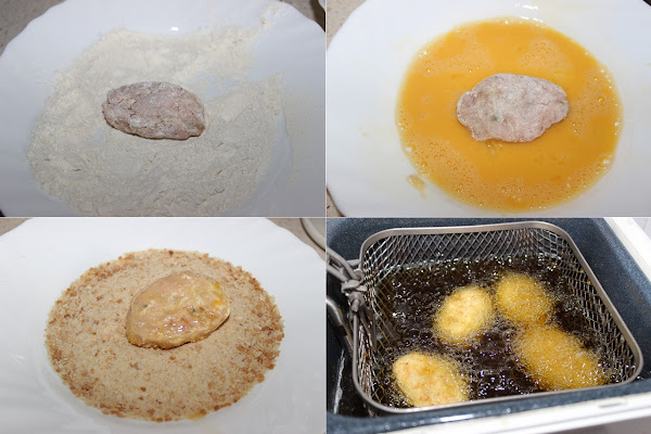 Los pasamos por harina, después por huevo batido y por último por pan rallado. Los freímos en una sartén con aceite caliente o en una freidora. Los dejamos escurrir encima de papel de cocina para quitarles el aceite sobrante.