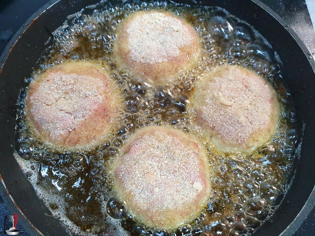Cogemos trocitos y los pasamos por pan. Los freimos en un poco de aceite, despacito, para que se hagan bien por dentro.