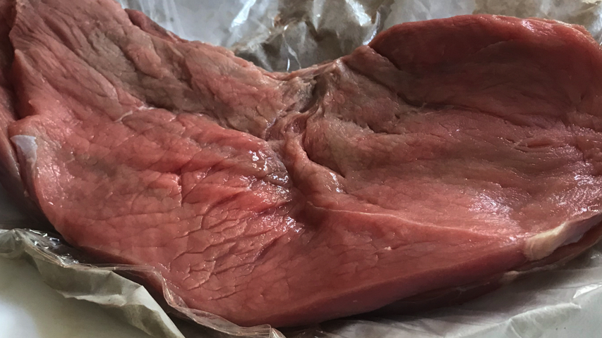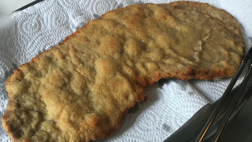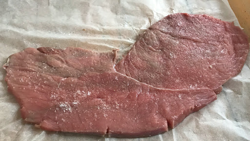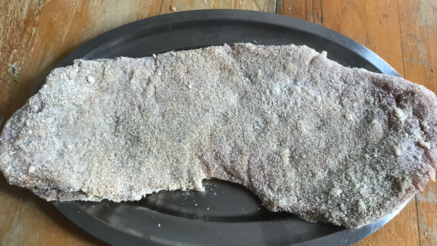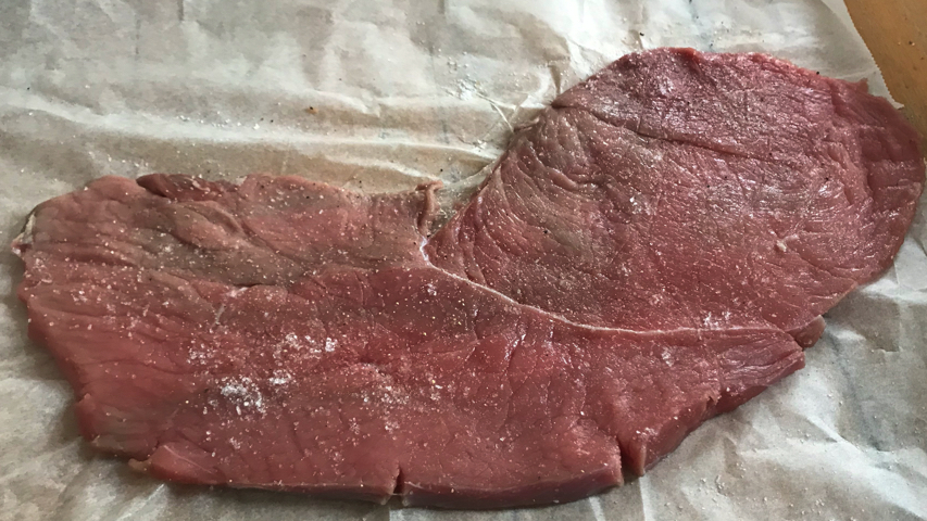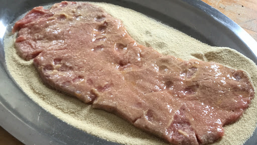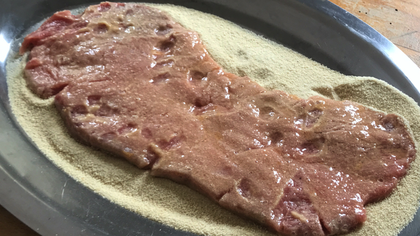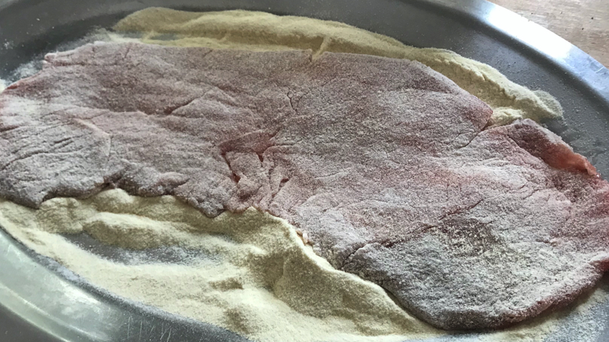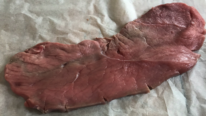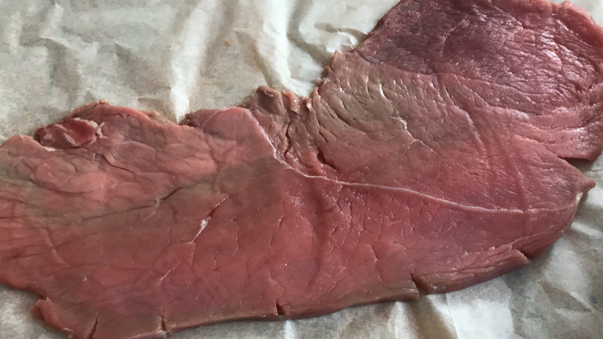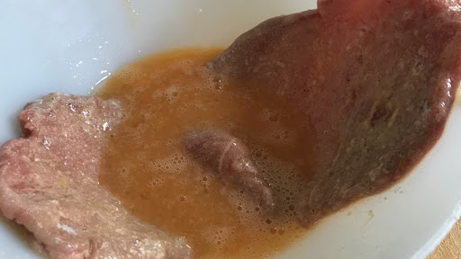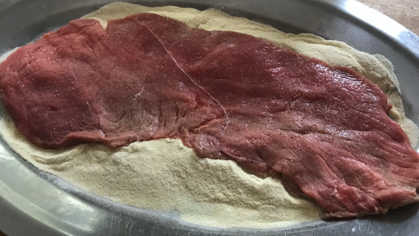 Aplasta los filetes de uno en uno entre dos plásticos o dos papeles de hornear.
