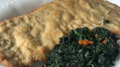 Sirve acompañado de la guarnición que gustes. Yo lo he acompañado de espinacas cocidas al vapor y después les he añadido pimiento rojo y ajos picados en trocitos pequeños en esta ocasión.