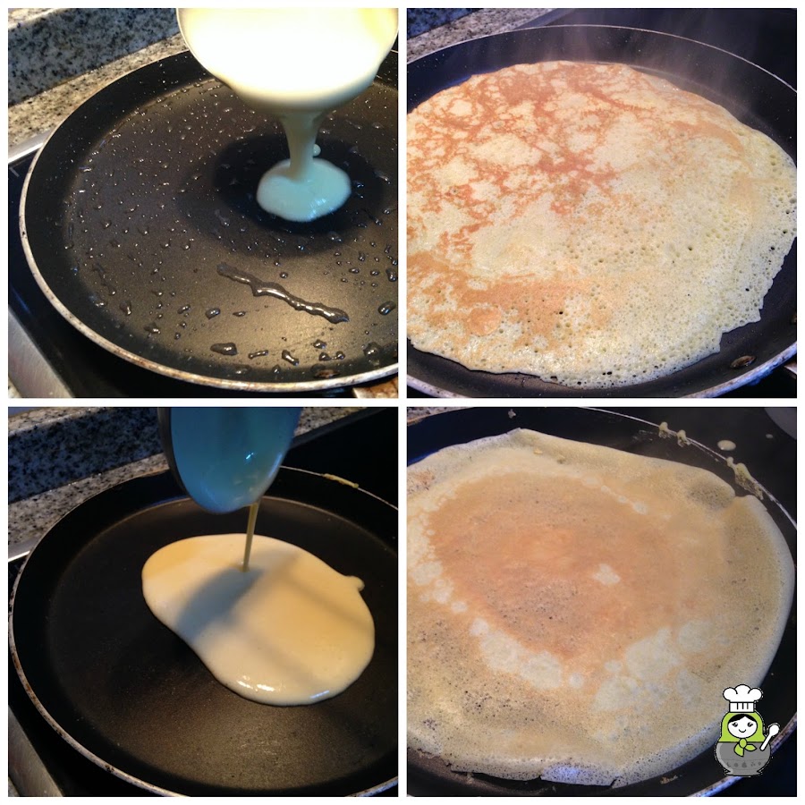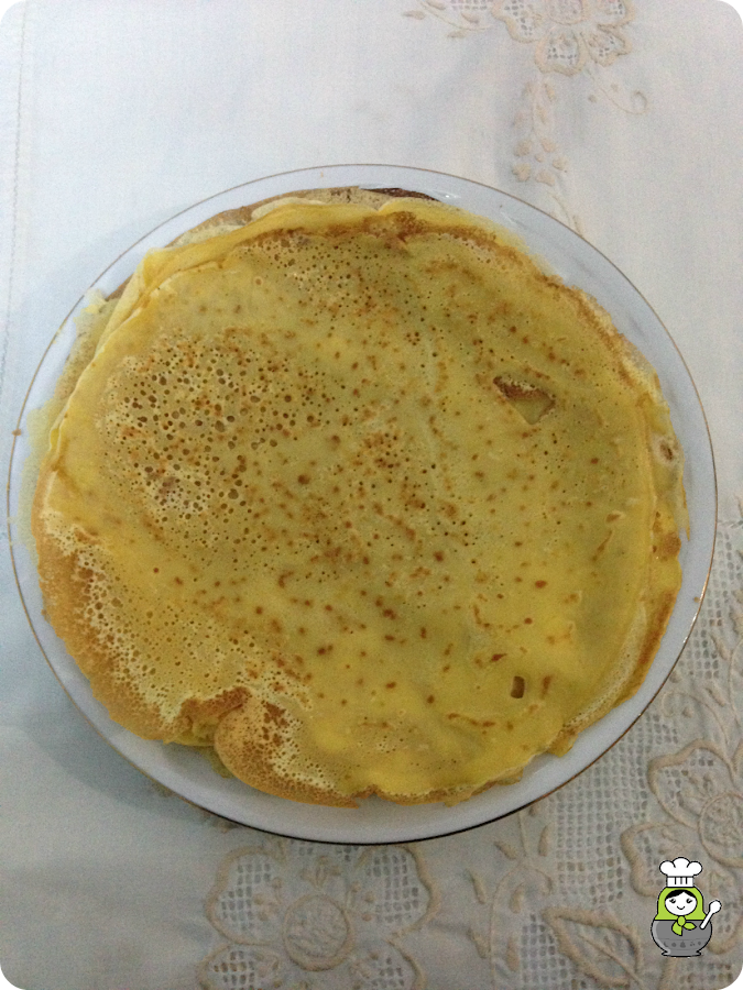 Ahora que la masa está lista, engrasamos una sartén de hierro o antiadherente (o una crepera) con el tocino. Esta operación habrá que repetirla en varias ocasiones. Dejamos caer en la sartén con ayuda de un cucharón la cantidad de masa necesaria para hacer una filloa muy fina (sobre medio cucharón), mientras realizamos lentamente movimiento circulares con la sartén para estirar bien toda la masa. En cuanto cuaje, levantamos el borde con ayuda de un cuchillo, por ejemplo, levantamos la filloa de la sartén y cogiéndola con los dedos le damos vuelta. La dejamos dorar unos segundos y la retiramos a un plato.