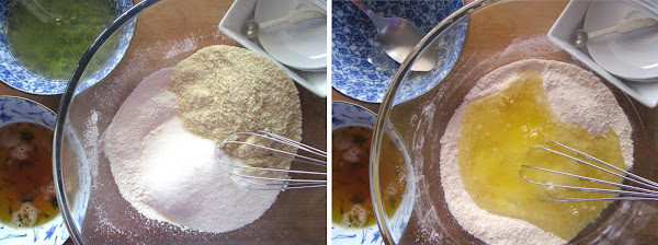 Mezclamos la harina tamizada con el azúcar, la harina de almendras, la pizca de sal y el impulsor. Añadimos las claras ligeramente batidas y templadas. Puedes calentarlas ligeramente en el microondas, con un par de tandas de 10 segundos, teniendo cuidado de no cuajarlas.