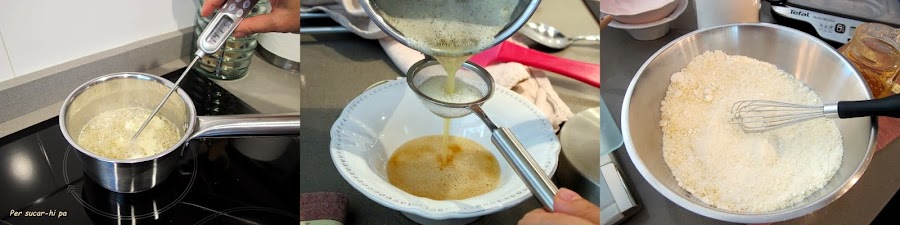 Primero prepararemos la mantequilla avellana. Colocarla en un cazo pequeño y calentar hasta alcanzar 150º. En caso de no contar con un termómetro de cocina, podemos saber que llega a esa temperatura cuando deja de crepitar y la mantequilla permite ver el fondo del cazo.