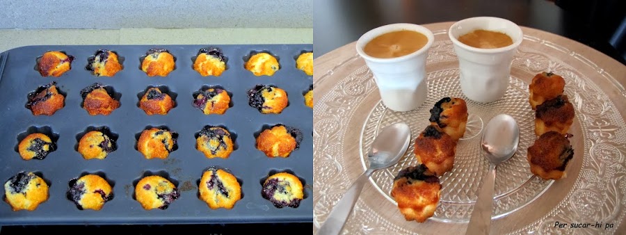 Rellenar los moldes hasta 2/3 partes en dos veces, colocando en medio los arándanos. Si utilizamos una manga pastelera resultará más fácil rellenarlos.