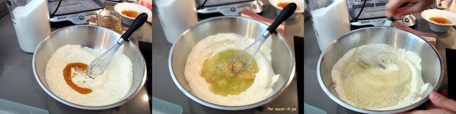 En un bol incorporar la harina tamizada, el azúcar y la almendra en polvo (sin grumos), mezclar los ingredientes.