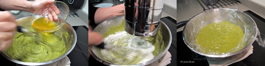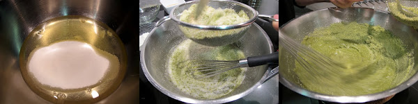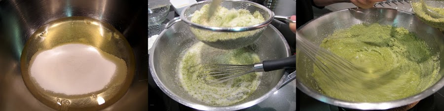 En un bol poner el azúcar y las claras, batir hasta que el azúcar se disuelva. Incorporar los frutos secos y el té matcha tamizados con un colador, desmenuzando bien los grumos. Mezclar bien. Incorporar la harina y remover bien la mezcla para que se integren todos los ingredientes.