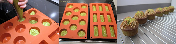 Poner la pasta en una manga y rellenar los moldes hasta 3/4 parte, decorar con el sésamo caramelizado.