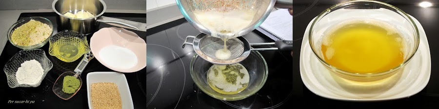 Calentar en un bol la mantequilla hasta alcanzar los 150ºC, o bien hasta que deje de crepitar, esto nos indicará que la mayor parte del agua que contenía se ha evaporado y la mantequilla se ha tostado adquiriendo un ligero sabor avellana. Retirar del fuego, colar y verter en un recipiente. Reservar mientras pierde calor.