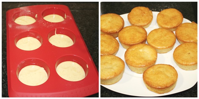 Pondremos un poco de masa en moldes redondos (se puede hacer también en moldes alargardos, pero originariamente eran redondos). En mi caso he utilizado una cuchara de helado mediana, y esta ha sido la medida.