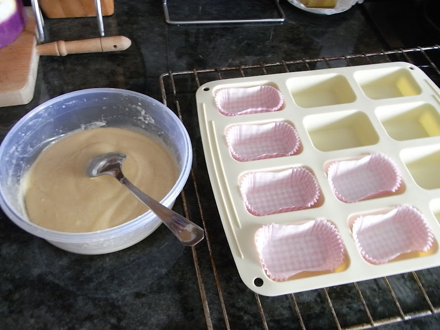 Cuando hayan pasado las horas de reposo, se saca la mezcla de la nevera para que se vaya atemperando, se enciende el horno a 180 grados,yo lo pongo sin aire, se preparan unas cápsulas de papel en el molde y se rellenan con la mezcla hasta un poco más de la mitad.