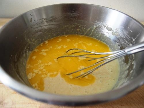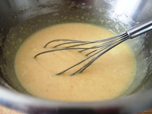 Y finalmente incorporamos nuestra mantequilla derretida, esta no tiene que estar muy caliente (se recomienda una temperatura de 40°c.). Comenzar a incorporar lentamente ya que ambos elementos se resistirán a la emulsión.