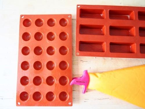 Verter la preparación en una manga pastelera, esto nos ayudará a verter la masa en los moldes. Yo utilicé 2 tipos de moldes, la idea es que no sean muy profundos ni muy anchos. Obviamente según el tipo molde va a variar el tiempo de cocción.