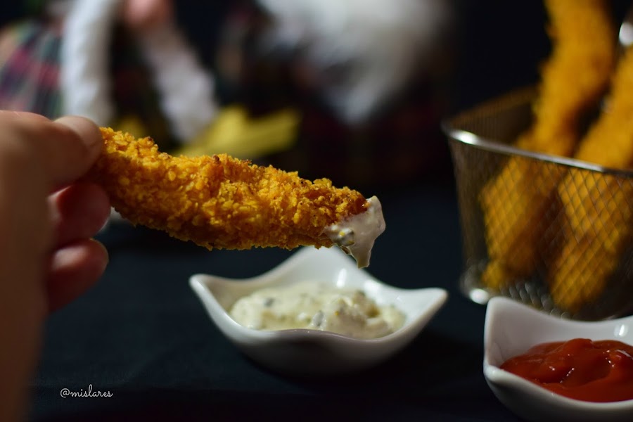 3. Salamos las pechugas y las rebozamos pasándolas por harina, huevo y los doritos picados.