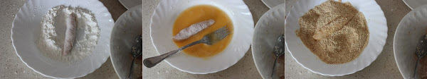 Lo pasamos primero por harina, luego por el huevo batido y por último por el pan rallado.