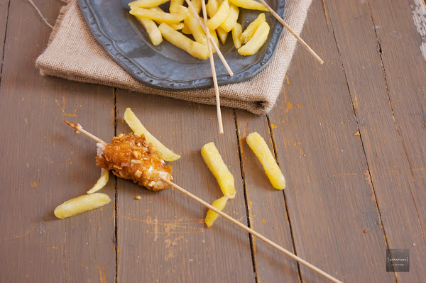 Trituramos los kikos y los cereales, podéis hacerlo con un mortero (como hice yo ) o en en un robot que conseguiréis el rebozado más fino Pasamos los fingers por harina, después por huevo batido, para terminar por el rebozado de kikos y cereales. Freímos en una freidora o en una sartén amplia. Yo lo hice en una sartén amplia, con la brocheta hay que ir disponiendo con cuidado para que los fingers se hagan bien por todo lados. En caso de que hagáis mucha cantidad y todas con brocheta os recomiendo hacerlo en freidora. Cuando estén dorados sacamos y ponemos sobre papel absorbente para que suelten el exceso de aceite. Servimos acompañados de unas patatas fritas o chips.