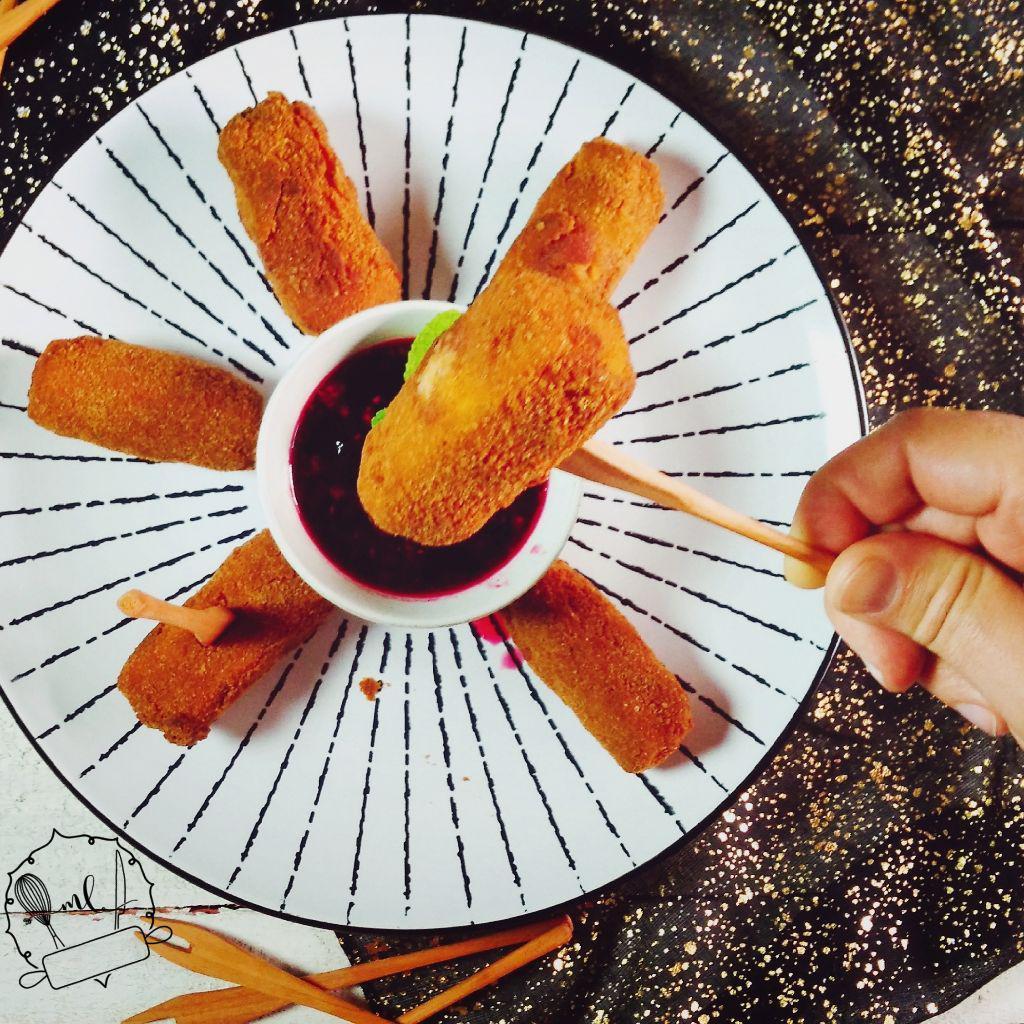 En éste caso yo he servido los fingers de queso como solía hacerse en mi cocina (bueno, allí habría usado salsa de arándanos rojos y aquí he usado mezcla de frutos rojos) ya que el contraste dulce y al mismo tiempo ácido refresca el hecho de que hayan sido fritos. También se pueden hacer al horno (y sería la opción mucho más saludable) pero a mi me apetecían a la manera tradicional.
