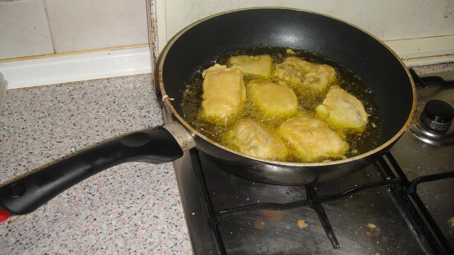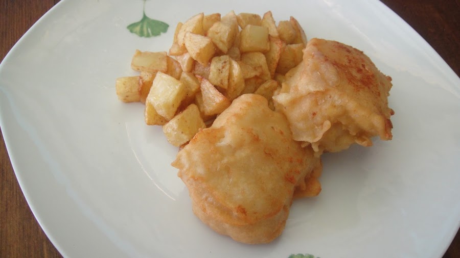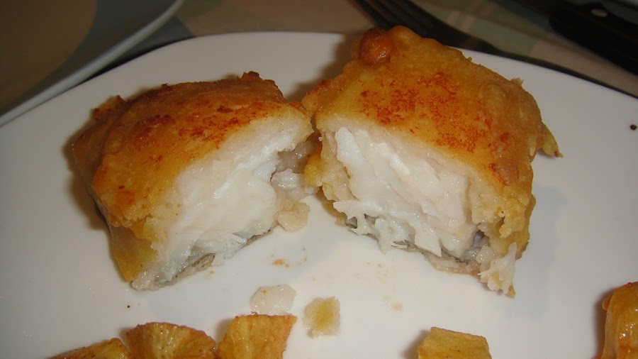 Receta típica londinense, adaptada a la cocina española y los ingredientes que aquí tenemos, consiste en pescado rebozado, el pescado suele ser salado (tipo bacalao) y el rebozado tiene un toque dulce, el toque dulce se consigue con miel. Queda un pescado crujiente con un sabor especial.