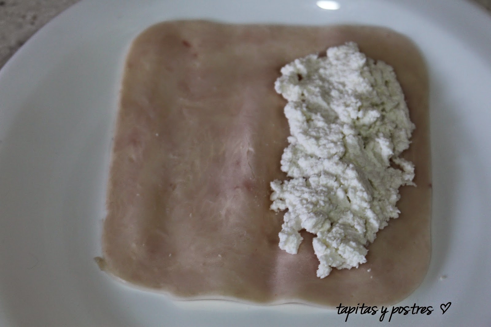 Sobre una loncha de pechuga de pavo colocamos una cucharadita de requesón desmenuzado en un lado.