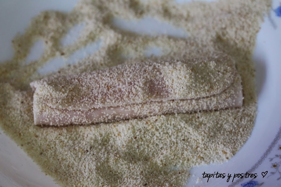 Colocamos las lonchas de pechuga de pavo sobre un plato y ponemos una cucharadita de requesón desmenuzado, encima una cucharadita de espinacas rehogadas. Enrollamos, pasamos por huevo batido y pan rallado y freímos en abundante aceite caliente.