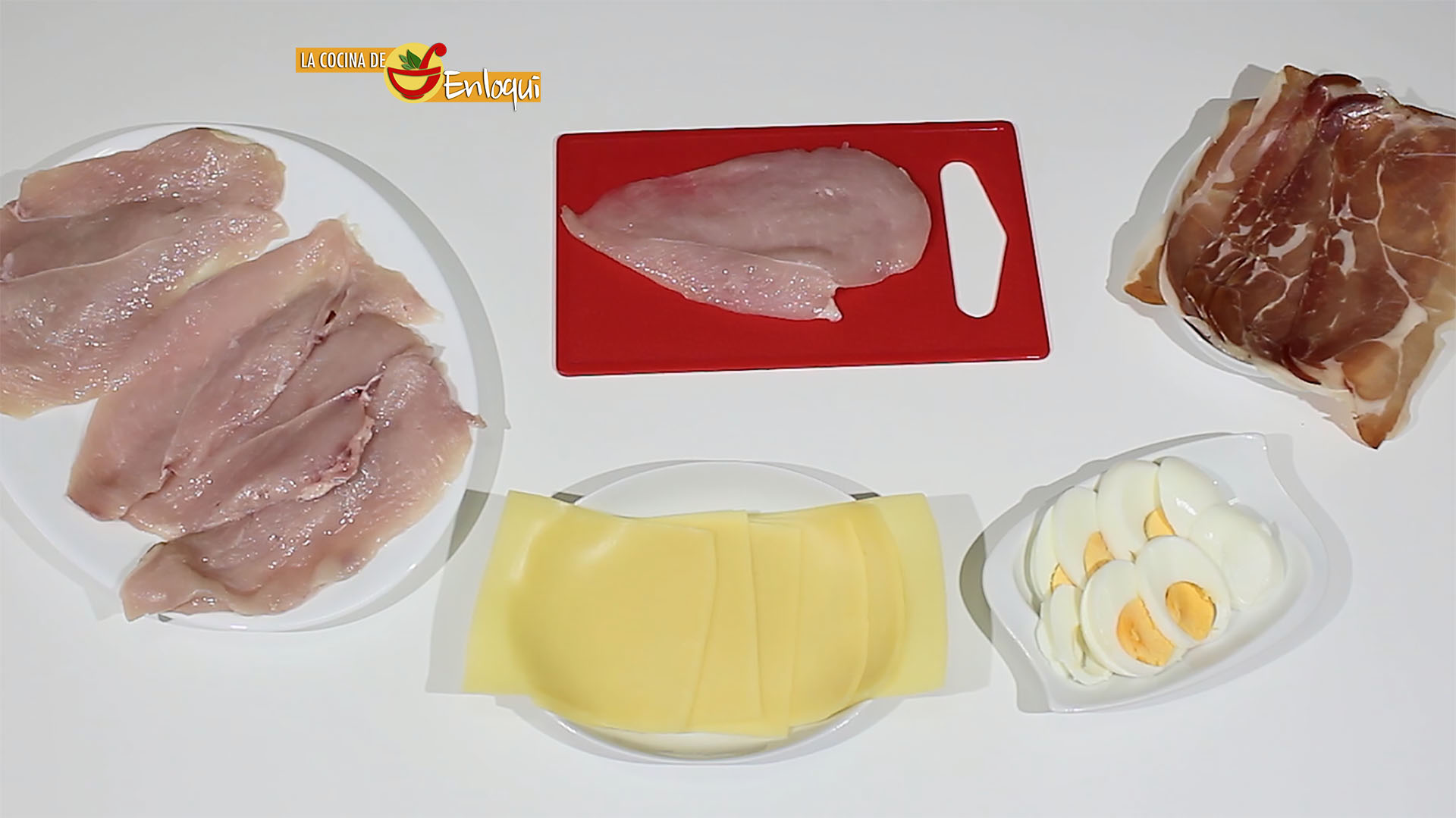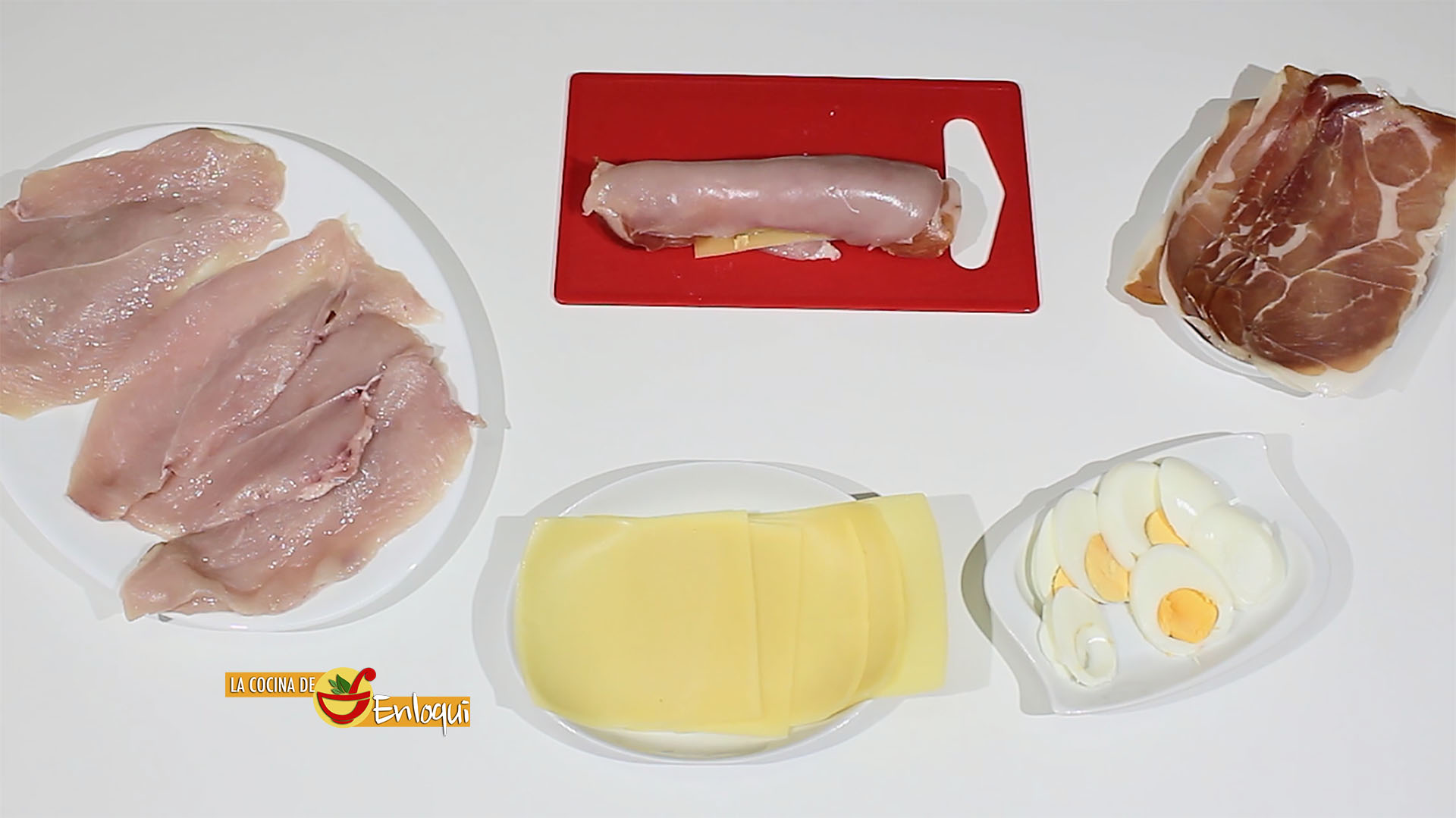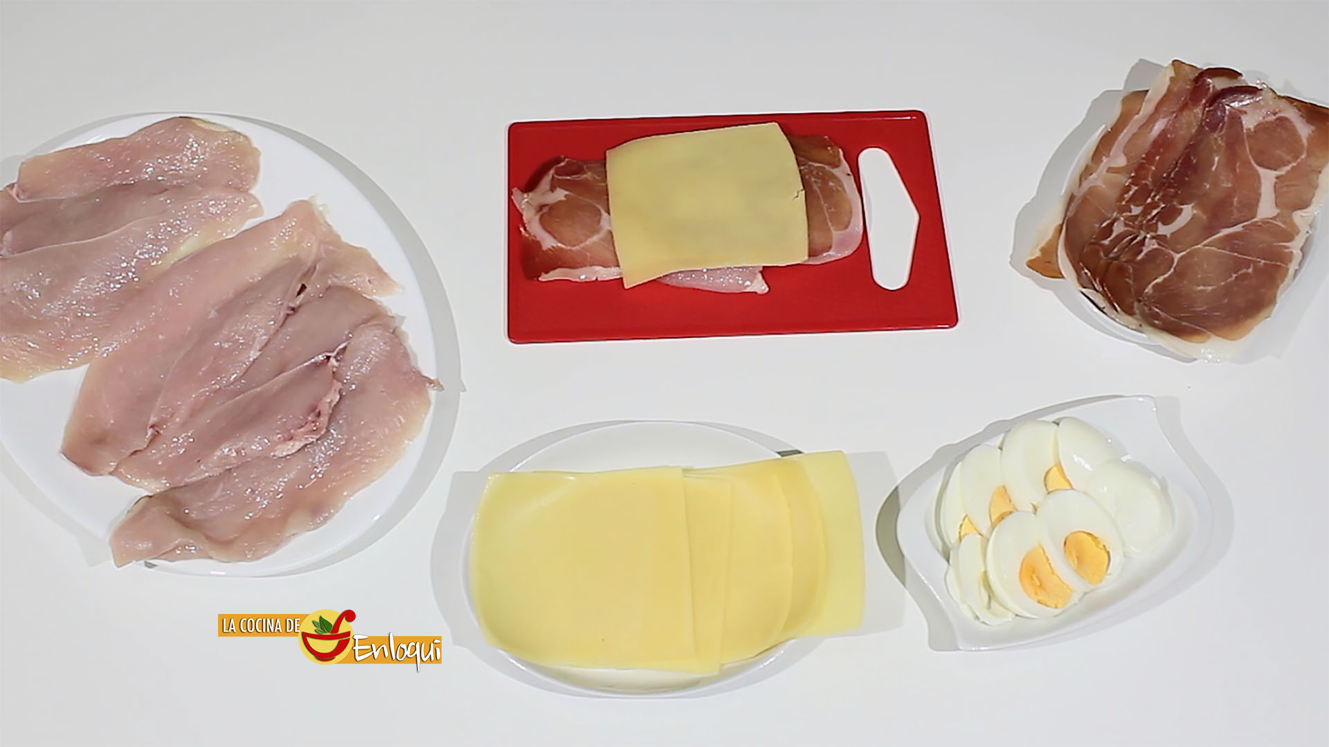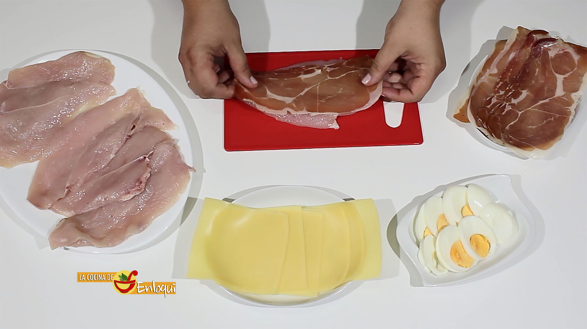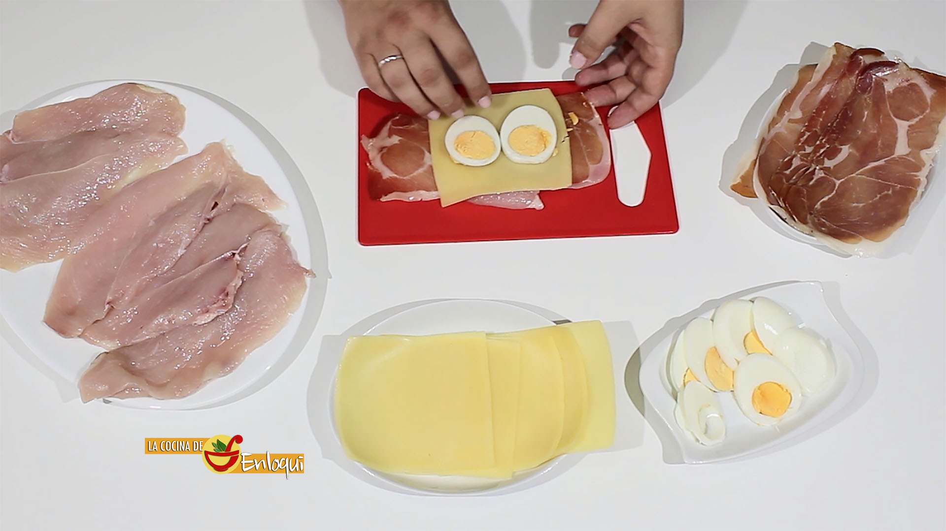 Para preparar los flamenquines de pollo y jamón serrano comenzamos extendiendo un filete de pollo sobre la superficie de trabajo. Coloca sobre el filete una loncha de jamón, otra de queso y un poco de huevo duro.