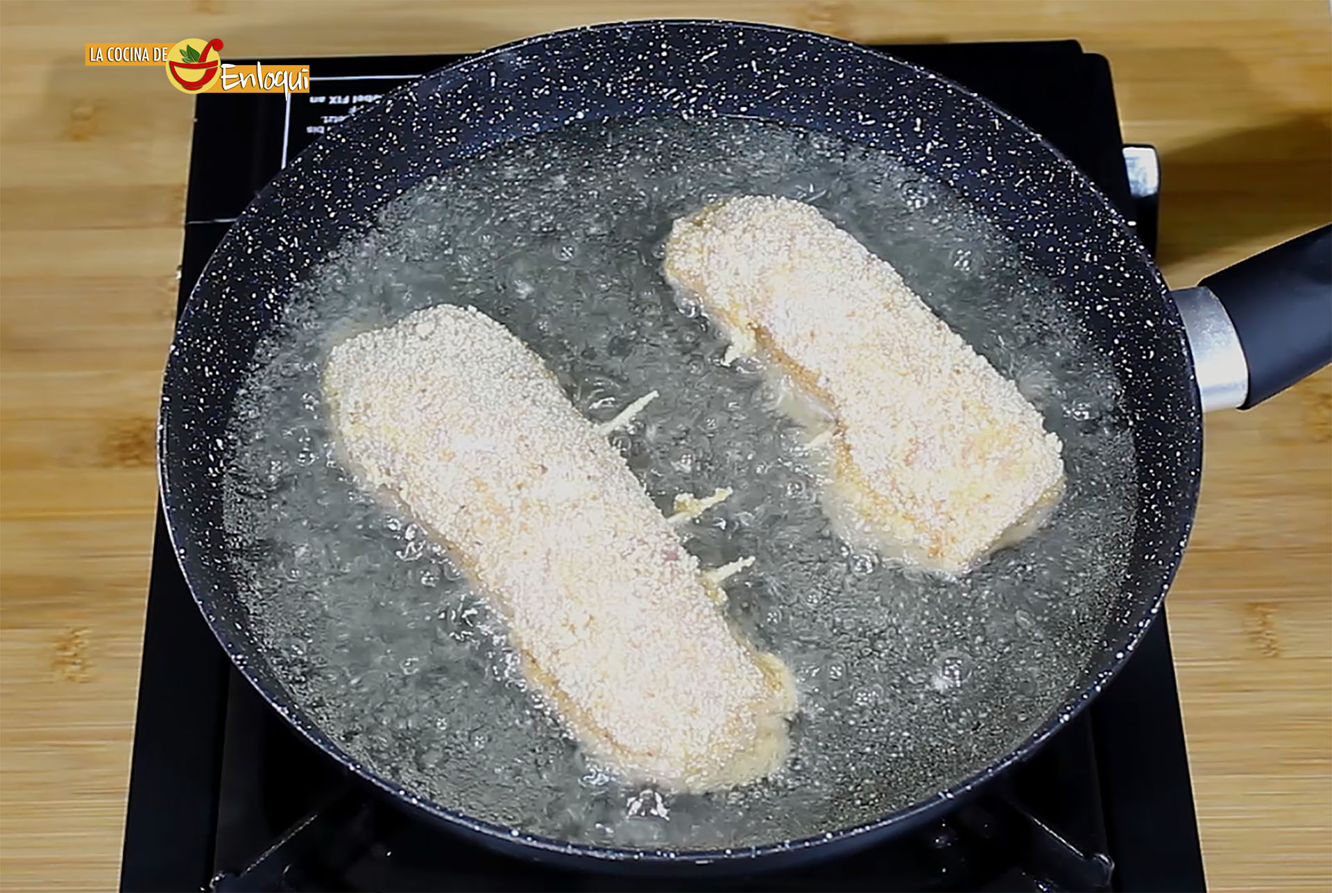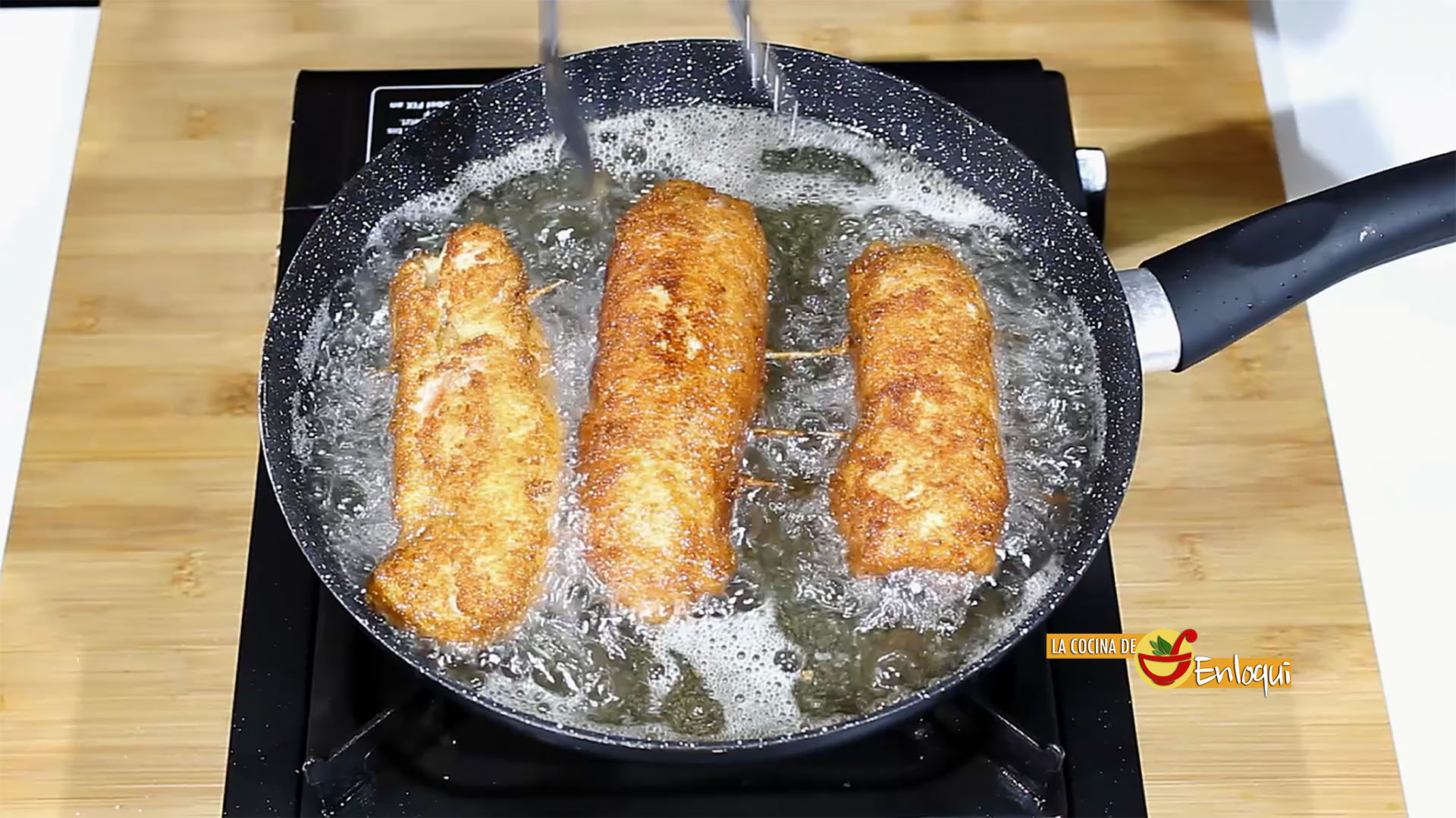 En una sartén pon un buen fondo de aceite a calentar, el suficiente para que los flamenquines quedes sumergidos a la mitad en el aceite. Fríe ahí los rollos de carne rebozados. Cuando estén dorados por un lado, da la vuelta y fríe hasta que quede dorado por toda la superficie.