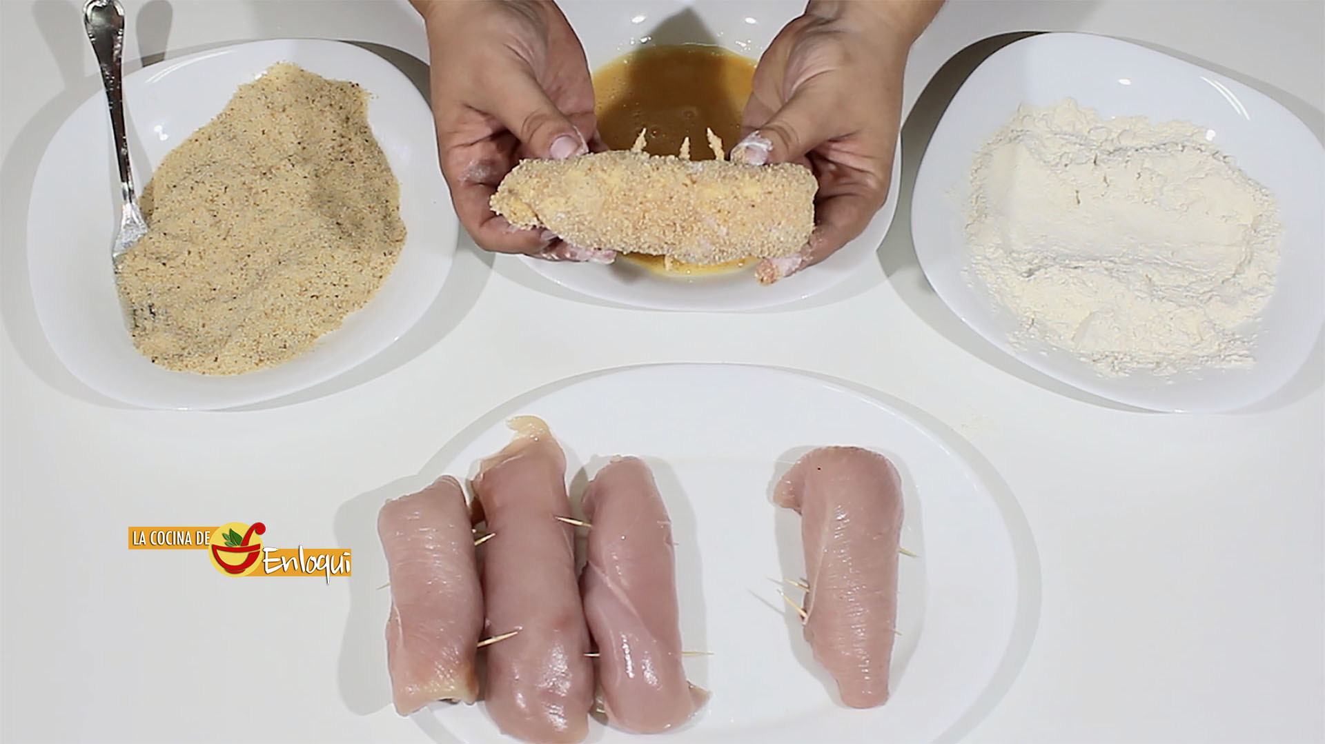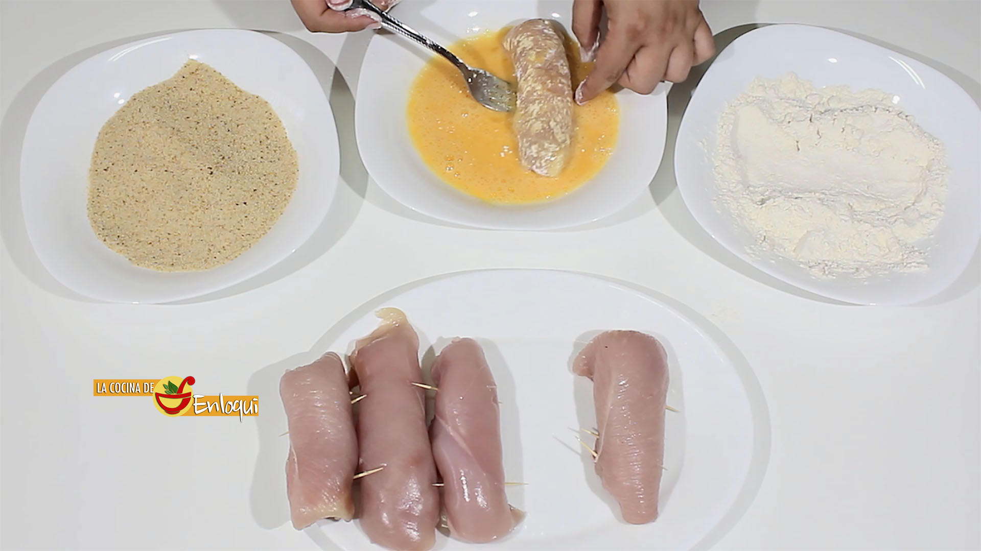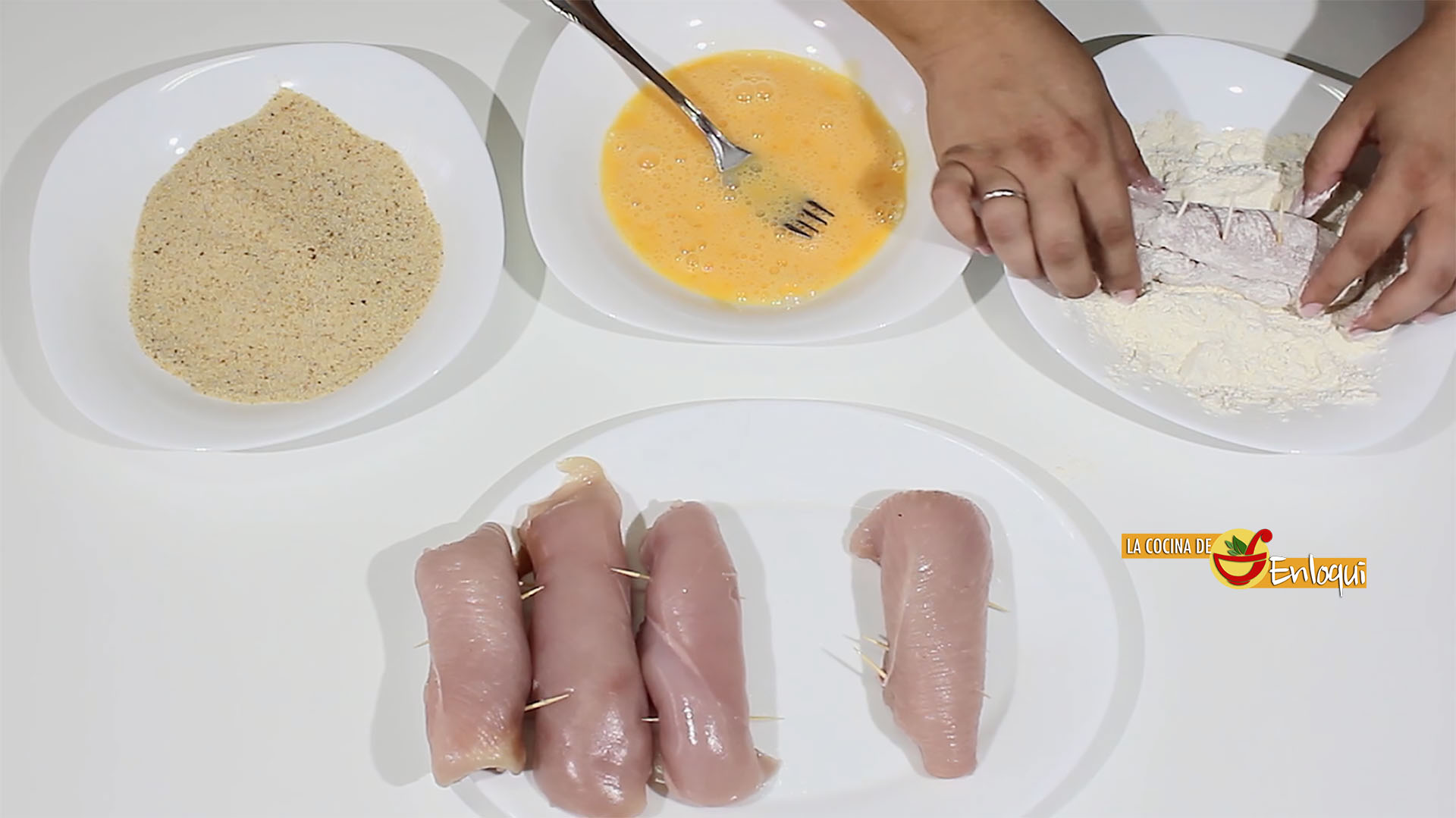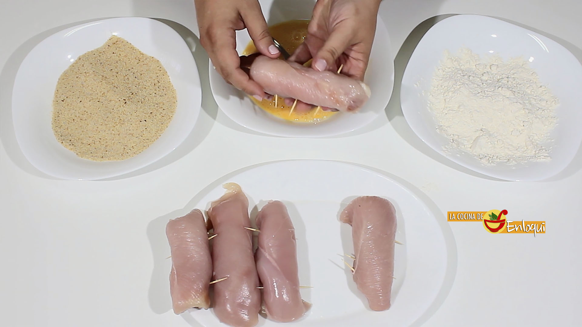 Enrolla sobre sí mismo para dar la forma tan característica del flamenquí y con la ayuda de unos palillos cierra y sujeta para que no se abra después al freír.