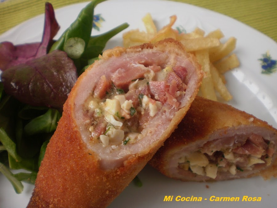 Posteriormente enrollarlo y pasarlo por harina, huevo y pan rallado, (si quieren que estén más crujientes, volver a rebozar otra vez en huevo y pan rallado)