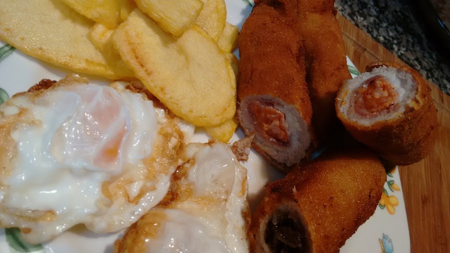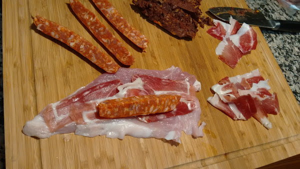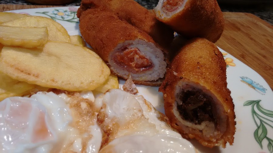 Enrollamos los flamenquines poniendo jamón y chorizo ó morcilla según corresponda.