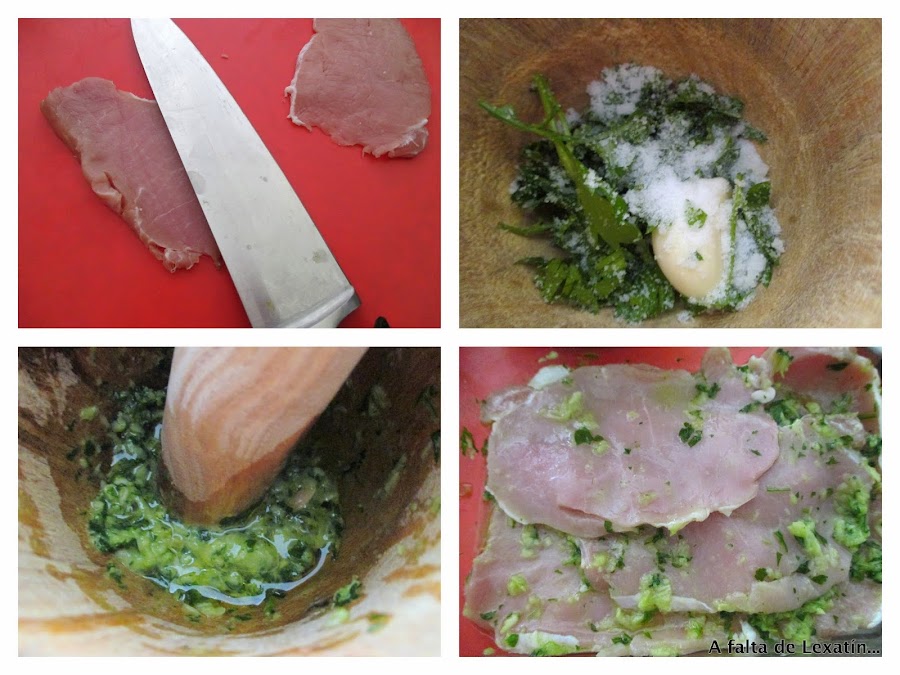 Hacer un machado con un ajo, un puñado de perejil, sólo las hojas,y un pellizco de sal gorda. Añadir zumo de medio limón y un chorrito de aceite de oliva y embadurnar los filetes con este machado. Dejar reposar al menos una hora para que coja bien del sabor