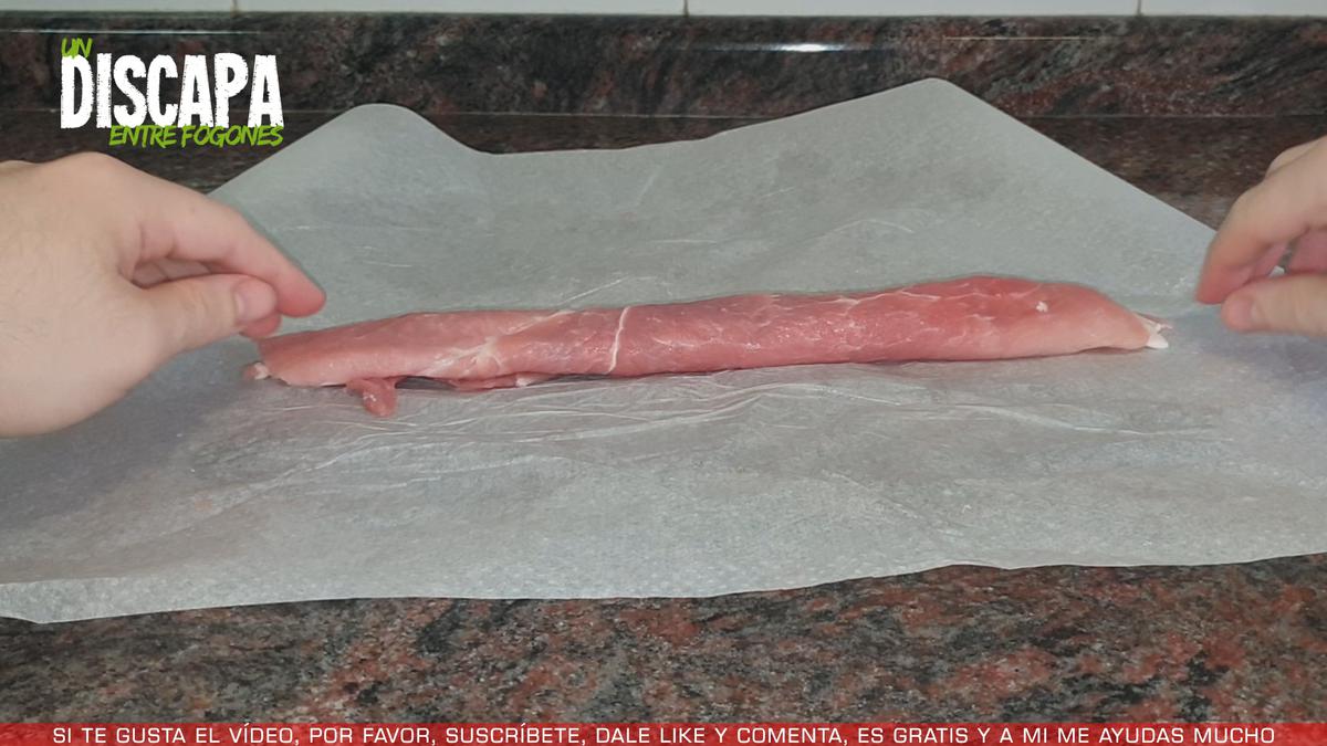 Lo cubrimos con papel de horno y le damos unos golpes para dejarlo más fino y así también conseguir un filete más grande.