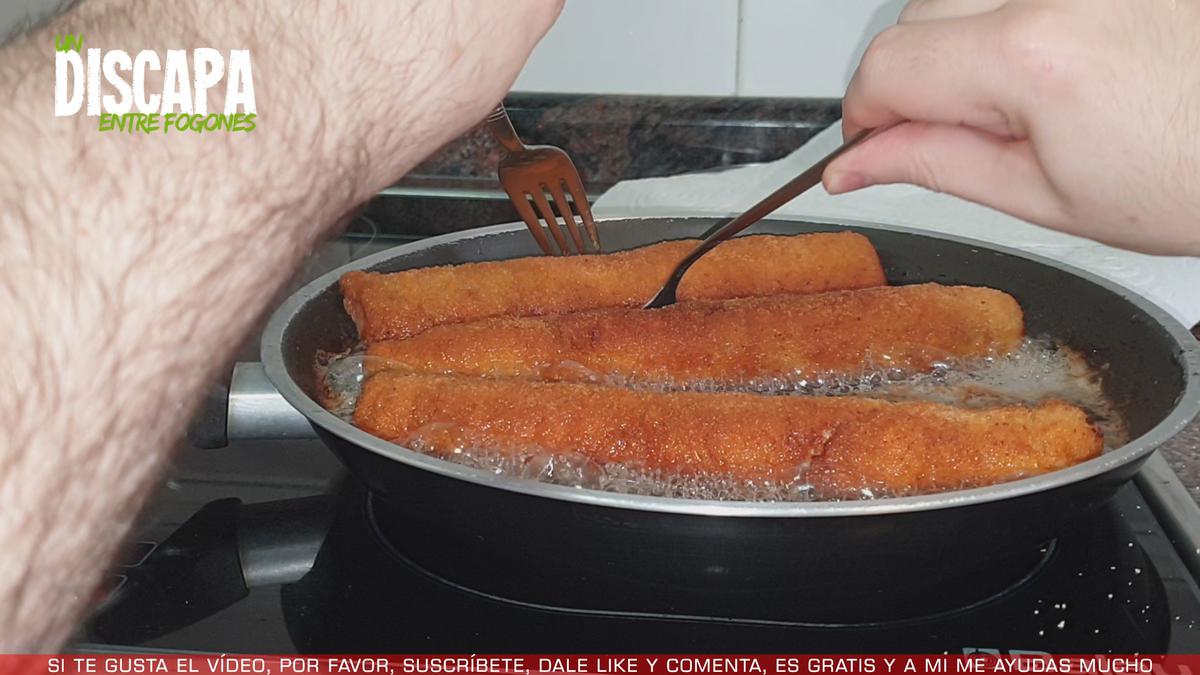 Cuando el aceite está caliente añadimos los flamenquines y dejamos que se vayan dorando por todos los lados a fuego medio.