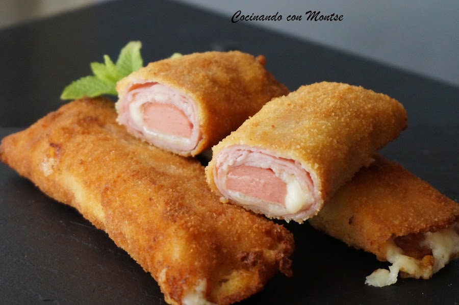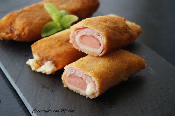 Están riquísimos, con un buen jamón dulce, salchichas frankfurt de las que más os gusten y un buen queso cremoso para fundir, quedan geniales, ya solo queda rebozarlos con harina, huevo y pan rallado .