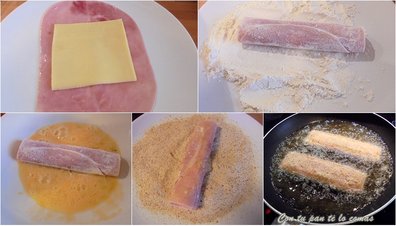 1. En cada loncha de jamón colocamos la de queso más o menos a la mitad. Los enrollamos y los pasamos por harina (sacudiendo el exceso), huevo batido y por último pan rallado. Si quieres un empanado más grueso vuelve a pasarlos por huevo y otra vez por el pan.