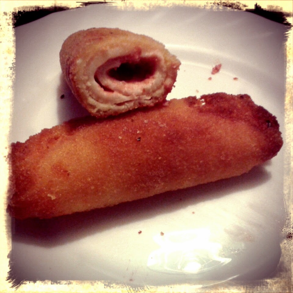 Ponemos abundante aceite de oliva en una sartén y cuando está bien caliente freímos nuestros flamenquines. Cuando están dorados por ambos lados ya están listos para comer.