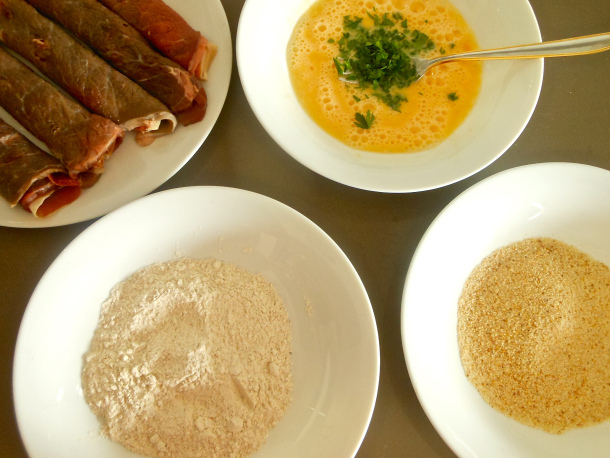 Pasa cada rollo de ternera y jamón por la harina, los huevos y el pan rallado siguiendo ese orden.