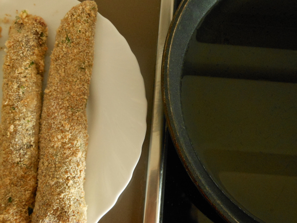 Dispón unas cucharadas de harina de trigo en un plato hondo; procede del mismo modo con el pan rallado.