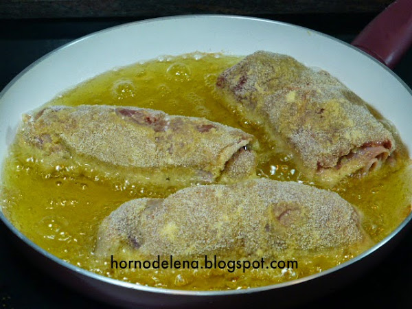 Ya formados, lo pasamos por la harina, huevos batidos y pan rallado. Los freímos en aceite de oliva.
