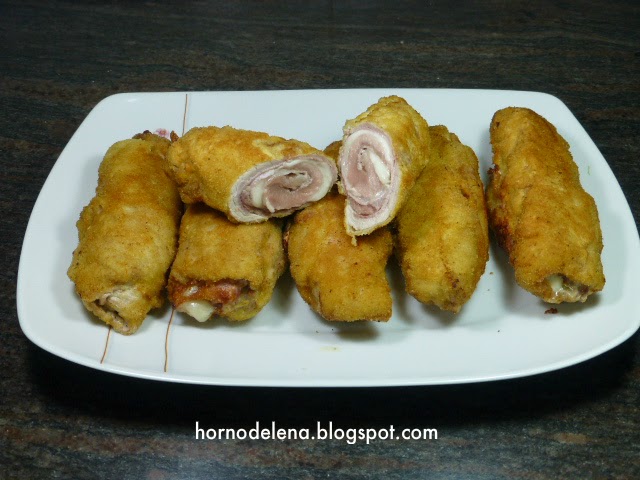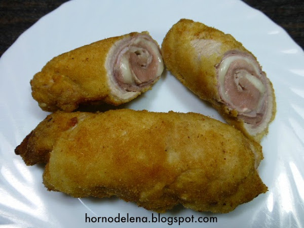 Salamos las chuletas, ponemos una a una en un plato, añadimos una loncha de jamón york y otra de queso. La enrollamos hasta formar el flamenquín.
