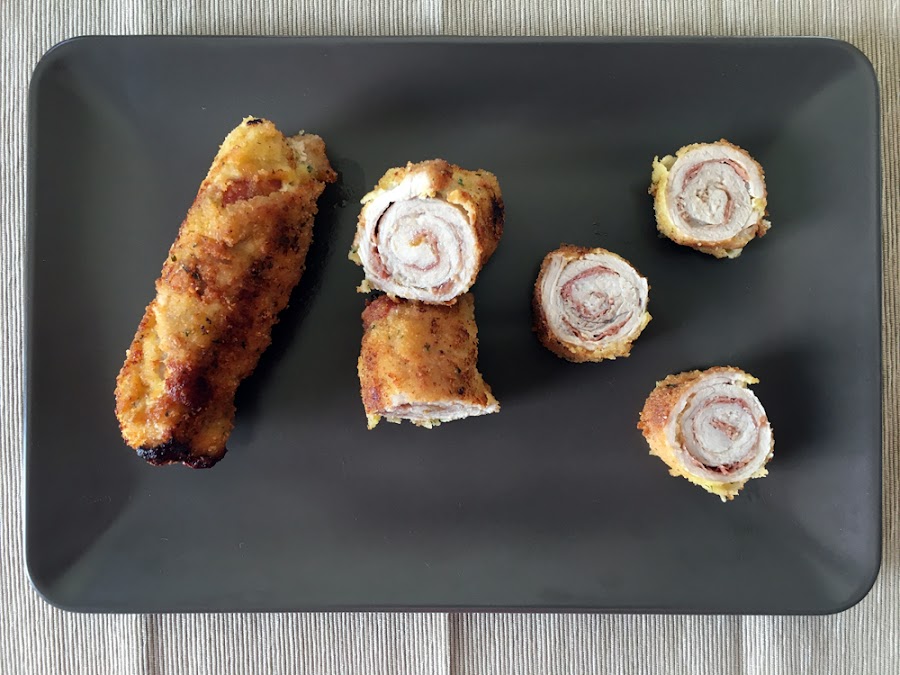 Extendemos los filetes de cerdo, los salamos ligerísimamente, ponemos encima una loncha de jamón serrano y enrollamos