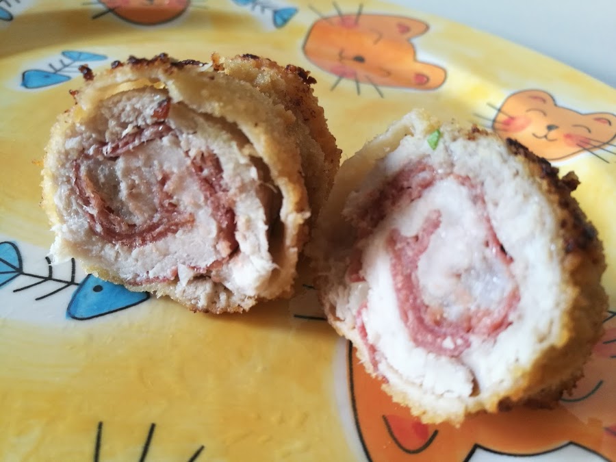 - Enrollamos cada loncha de lomo con una de jamón dentro y cerramos con un palillo, que no se abra al freír.